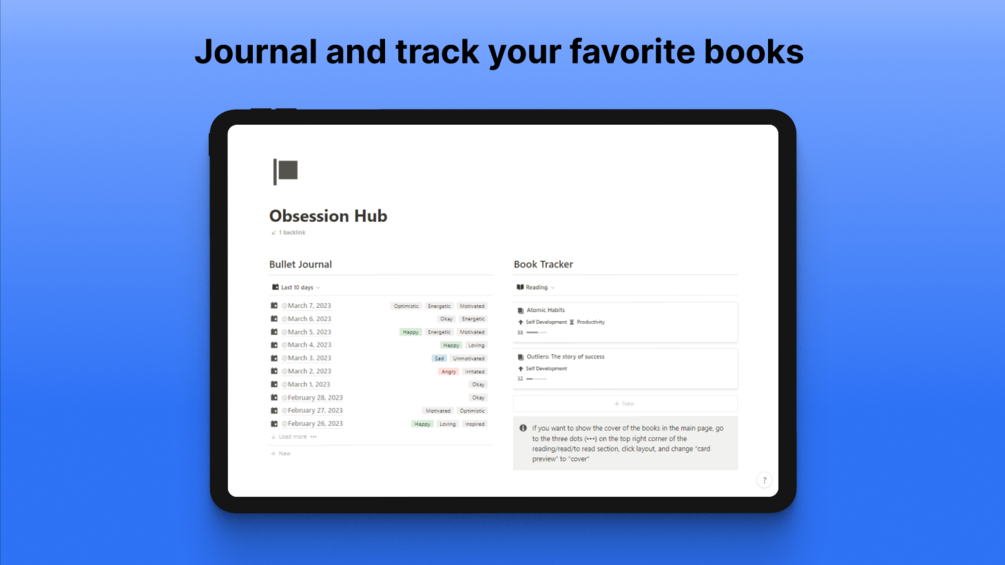 With the Obsession Hub, you'll have everything you need to stay on track and focused. The bullet journal section will help you track your emotions, habits, and daily routines, allowing you to identify patterns and make adjustments as needed. The habit tracker will help you build positive habits and break bad ones, while the book tracker will ensure you never lose track of what you're reading.